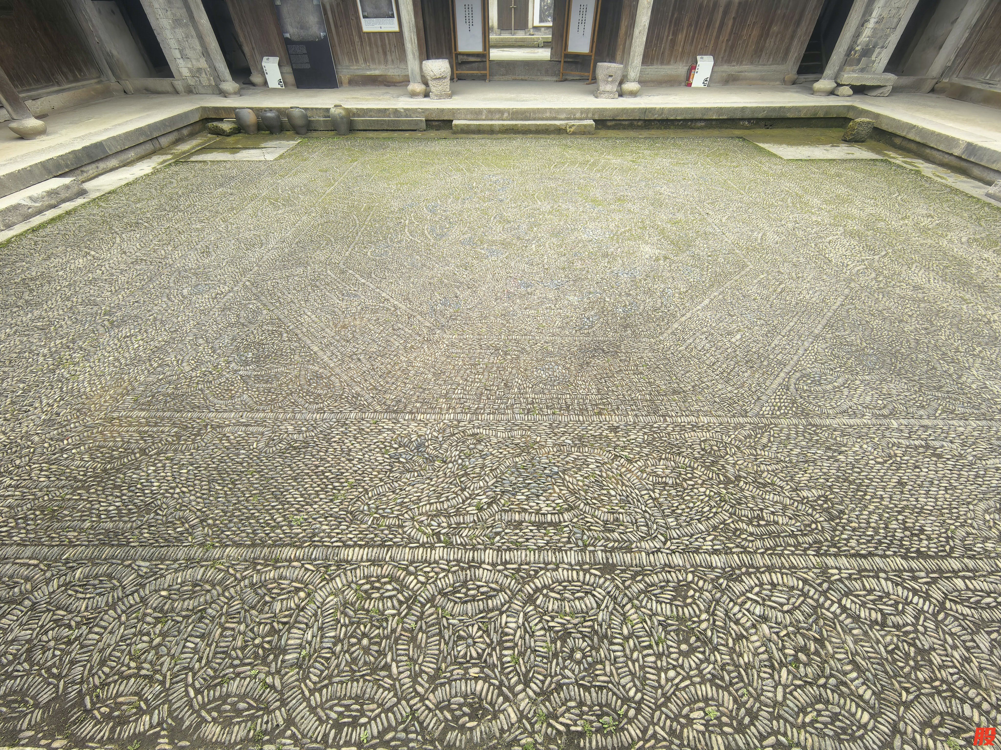 但朱成的目光不只停留在恢弘的马头墙和斗拱飞檐上,在由鹅卵石铺满的天井中,朱成蹲下身,指尖轻轻摩挲着地面。“你看,这些卵石都是从永安溪里捞上来的,每一颗都被河水冲刷得温润如玉。”朱成缓缓道来,这是一幅历经百年风雨依然清晰的“双狮戏球图”。